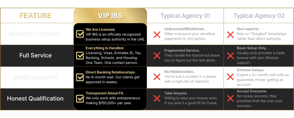 We are licensed, not just registered. We handle banking, visas, tax exit, and family relocation, not just the license. And we only take clients we can actually help. If you are not the right fit, we will tell you.